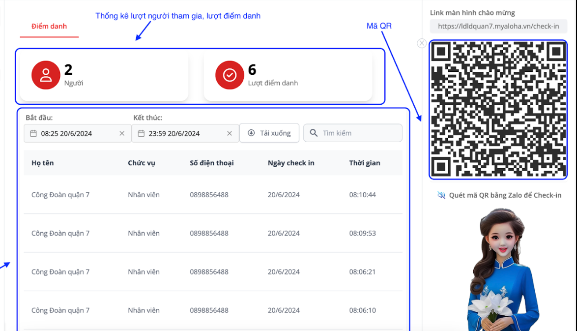 * Khi bấm vào link chào mừng sẽ xuất hiện giao diện của từng người đã tham gia điểm danh